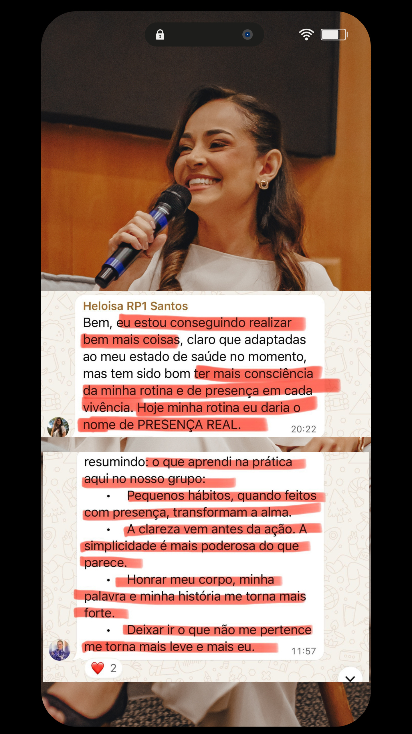 Todo o processo acontece dentro de um grupo exclusivo no WhatsApp. Todos os dias você receberá áudios, textos e materiais de apoio para aplicar na prática, além da interação direta com a mentora e com as outras participantes. Durante o processo, é incluso duas mentorias ao vivo (online) em grupo e uma individual.