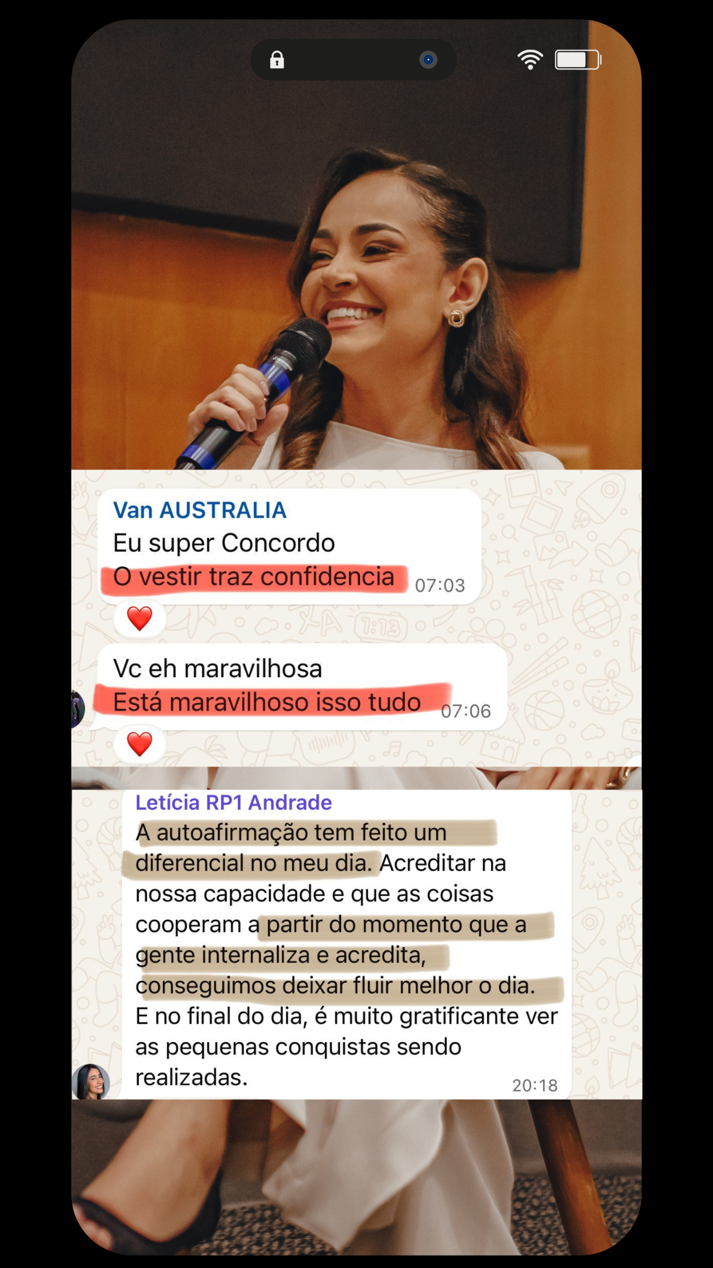 Todo o processo acontece dentro de um grupo exclusivo no WhatsApp. Todos os dias você receberá áudios, textos e materiais de apoio para aplicar na prática, além da interação direta com a mentora e com as outras participantes. Durante o processo, é incluso duas mentorias ao vivo (online) em grupo e uma individual.